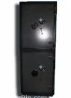 Сейф огнеупорный и противовзломный производства Украина, предназначен для хранения документов, денег, ценных бумаг, оружия и других ценностей. Такой сейф обеспечит защиту от взлома и сохранит содержимое от пожара (расчётная огнестойкость не более 60 минут). Данная модель имеет две секции (расположение секций - по высоте) с двумя независимыми замками. Конструктивно изготавливается таким образом: корпус - двустенный из двух листов стали (наружный лист металла 4 мм, внутренний 2 мм) сваренных между собою на расстоянии с заполнением внутренней полости; дверь из трёх листов стали сваренных между собою на расстоянии, наружный лист металла (8 мм), затем специальное заполнение между стенками, затем лист металла (4 мм), затем ригельная система, и затем внутренний лист металла (2 мм). Внутреннее заполнение - «сенгвич»: металл -базальтовое волокно-металл-фанера. Верхняя секция: Оборудована кодовым механическим замком: фирма/страна производитель замка "La Gard" (США): тип замка: кодовый (механический); количество комбинаций 1 000 000; код сменный, состоит из одного двухзначного числа или трёх двухзначных чисел; цвет замка - хром; количество ригелей - 6; диаметр ригелей - 28 мм; Направление закрытия ригелей - четырёхстороннее: два горизонтально слева, два горизонтально справа, один вертикально вверх, один вертикально вниз. Для удобства пользования при открытии и закрытии сейфа, на внешней стороне двери установлен поворотный штурвал. Код фиксирует механизм закрытия (замок открыт/замок закрыт), а штурвал приводит в движение ригельную систему (дверь отрыта/дверь закрыта). Конструкция ригельной системы исключает вскрытие сейфа путём силового воздействия на штурвал. Штурвал из пластика (на металлической основе), угол оборота 90 градусов, цвет - чёрный. Дверь изготовлена таким образом, чтобы максимально защитить замок сейфа и его ригельную систему от взлома - замок и механизм запирания защищены специальной пластиной из марганцевой стали что обеспечивает дополнительную защиту замка от высверливания. Оборудована отдельно запираемым внутренним отделением (трейзер). Месторасположение - внутри в верхней части верхней секции. Замок слева, петли справа. Толщина передней панели трейзера 8 мм. Изнутри замок защищён стальным коробом. Замок трейзера: производитель: Италия; тип замка: ключевой (сувальдный); тип ключа: 2-х бородковый; количество ригелей: 2; диаметр ригелей: 18 мм; в комплекте два ключа; длина ключа: 65 мм; направление закрытия ригелей - одностороннее: два горизонтально слева. Оборудована одной внутренней съёмной полочкой (без регулировки). Толщина металла полочки 2 мм. (Возможна установка регулируемой полочки, а также дополнительное количество полочек). Нижняя секция: Оборудована ключевым замком: фирма/страна производитель: "Mauer" или "STUV" Германия; тип замка: ключевой (сувальдный); тип ключа: 2-х бородковый; количество сувальд 8; количество ригелей - 6; диаметр ригелей - 28 мм; в комплекте два ключа; длина ключа - 120 мм. Направление закрытия ригелей - четырёхстороннее: два горизонтально слева, два горизонтально справа, один вертикально вверх, один вертикально вниз. Для удобства пользования при открытии и закрытии сейфа, на внешней стороне двери установлен поворотный штурвал. Ключ фиксирует механизм закрытия (замок открыт/замок закрыт), а штурвал приводит в движение ригель